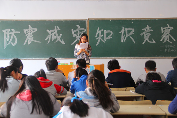 本次竞赛采用闭卷形式,组织委员任晓聪事先准备好三种避震题目——选择、简答和论述题,由团支书读题,两班同学将答案写于纸上上交。张海燕认真谨慎读题,力使同学们听清每道题目。两班同学严肃以对,根据刚学的《防震避震手册》和以前所学知识认真作答。本次竞赛共收集60分答题纸,张海燕表示,将会严格批改所收试题,对于成绩好的同学,进行物质奖励;成绩不好的同学,会再次进行知识普及。