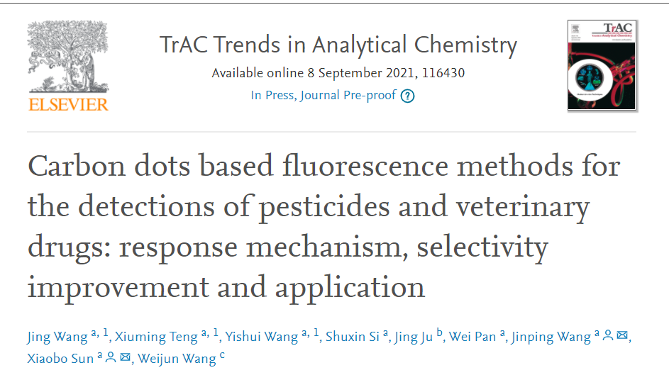 近日,太阳成集团tyc234cc王进平教授团队在分析化学领域顶级期刊《Trends in Analytical Chemistry》在线发表了最新综述论文《Carbon dots based fluorescence methods for the detections of pesticides and veterinary drugs: response mechanism, selectivity improvement and application》。太阳成集团tyc234cc2019级硕士研究生王静、滕修铭和王义水为共同第一作者,王进平教授和孙晓波副教授为共同通讯作者。该期刊是目前分析化学领域影响因子最高的期刊,中科院大类分区1区、TOP期刊,最新影响因子为IF=12.296。