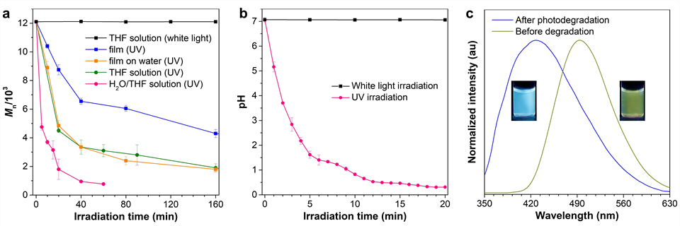 在聚合过程中原位生成的磺酸酯基团对白光稳定,但对紫外光非常敏感,所得到的聚合物在紫外 (365 nm) 光照下可迅速降解并产生强酸,同时发光波长明显蓝移(图2)。
