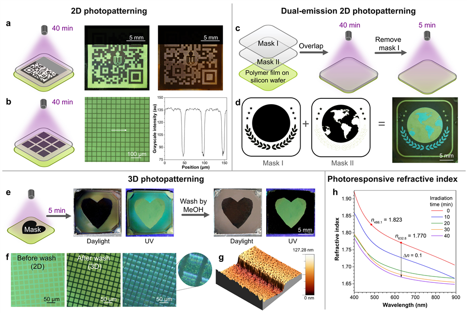 由于这类聚磺酸酯具有灵敏的光响应性、良好的成膜能力和固态发光的性质,他们是制备荧光二维或三维图案的优异材料,并在先进光电子器件中具有重要潜在应用。聚合物薄膜在短时间紫外光照下发生光降解,长时间紫外光照下被光漂白,因此利用单一聚合物材料便可制备复杂的双色荧光二维图案或者荧光三维图案,同时可以调控聚合物的折光指数(图3)。