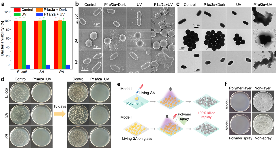 图4. 聚磺酸酯P1a/2a的光降解在广谱杀菌中的应用