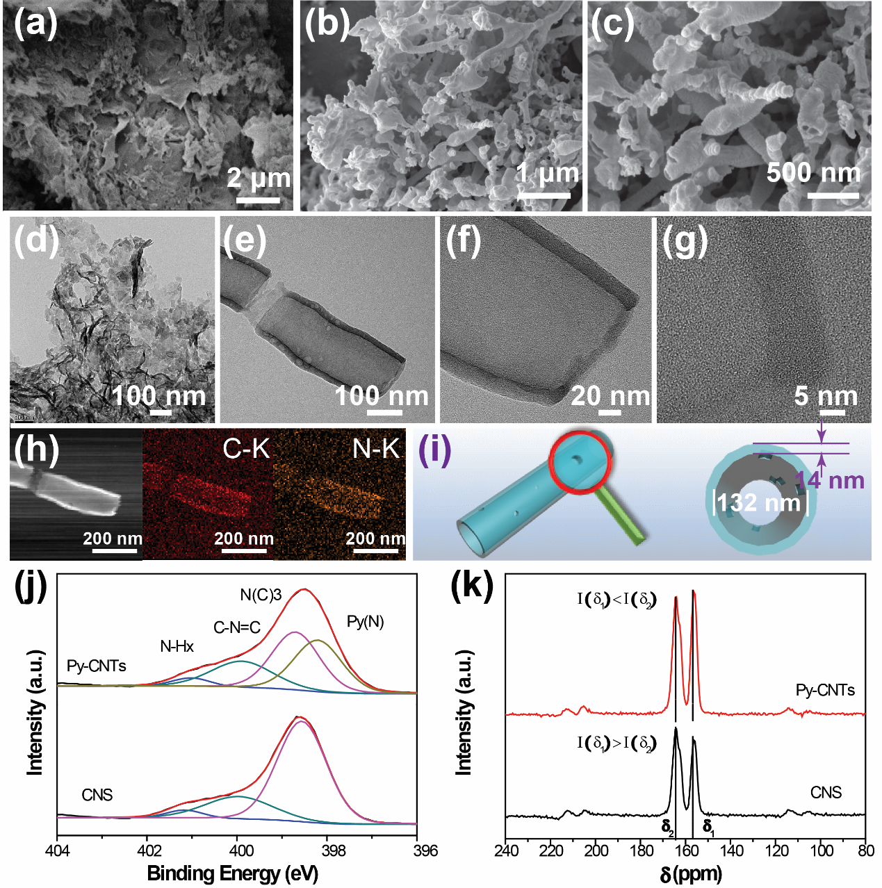 图1 (a) 原始的氮化碳纳米片和 (b, c) 富含吡啶的氮化碳纳米管的SEM 图。 原始的氮化碳纳米片的(d)TEM图。富含吡啶的氮化碳纳米管的(e, f) TEM, (g) HRTEM 和 (h) TEM mapping图。(j) 氮化碳纳米片和富含吡啶的氮化碳纳米管的 N 1s XPS谱图和 (k) 13C 固态NMR谱。