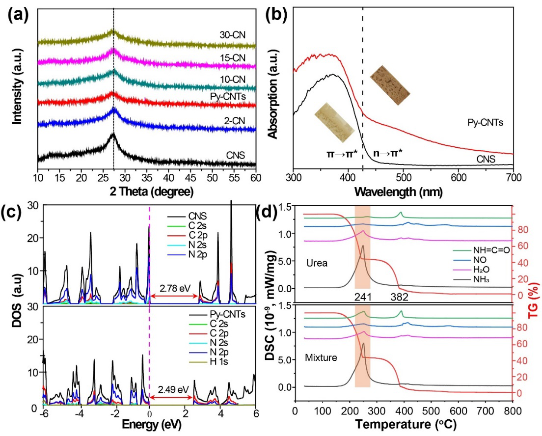 图2 (a) 所制备的氮化碳的XRD图。 (b) 氮化碳纳米片和富含吡啶的氮化碳纳米管的UV-vis吸收图。 (c) 氮化碳纳米片和富含吡啶的氮化碳纳米管的态密度图。(d) 脲、脲和半胱氨酸混合物的TGA-MS 图。