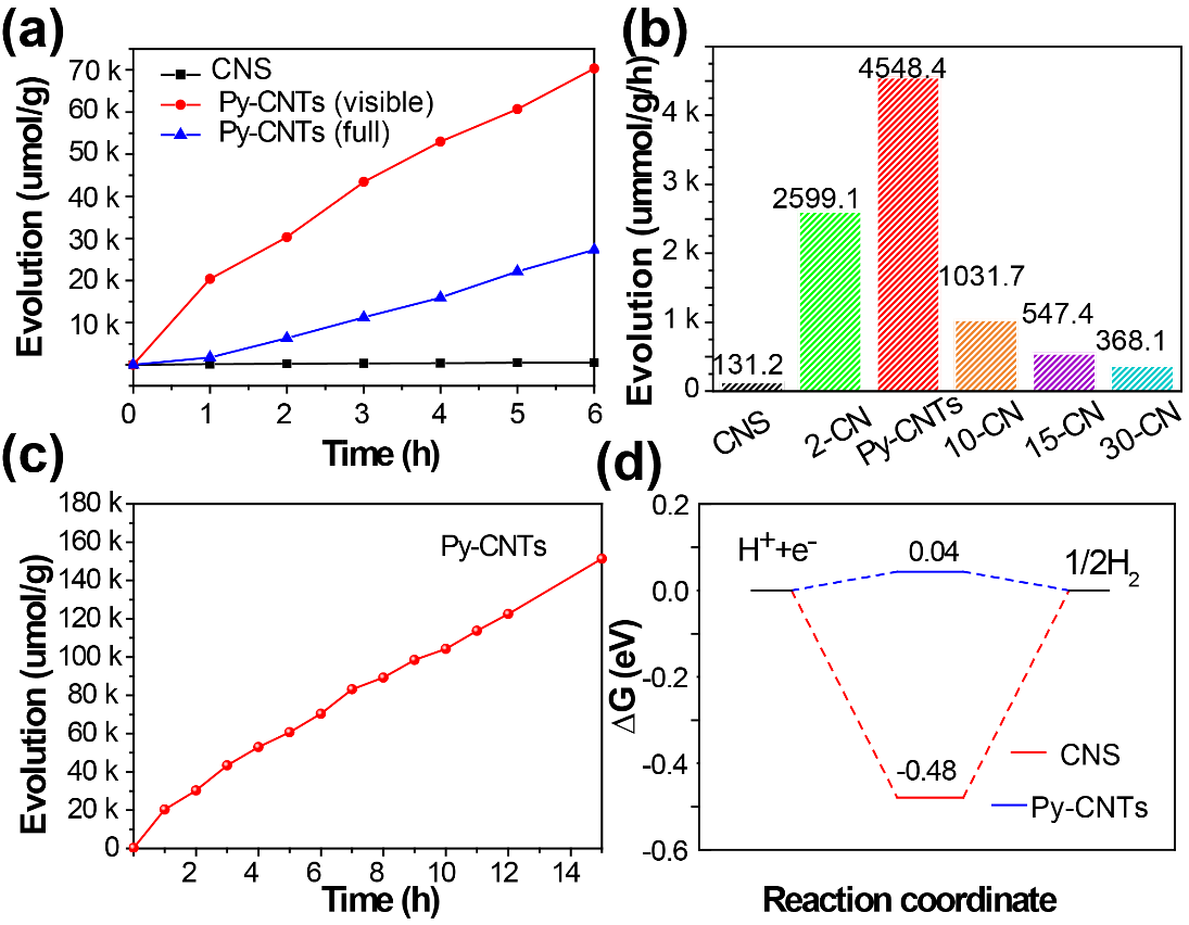 图3 (a) 氮化碳纳米片和富含吡啶的氮化碳纳米管的光催化产H2性能曲线图。(b) 半胱氨酸改性的氮化碳的产H2性能柱状图。 (c) 光照15小时富含吡啶的氮化碳纳米管的产H2图。(d) 氢吸附自由能。
