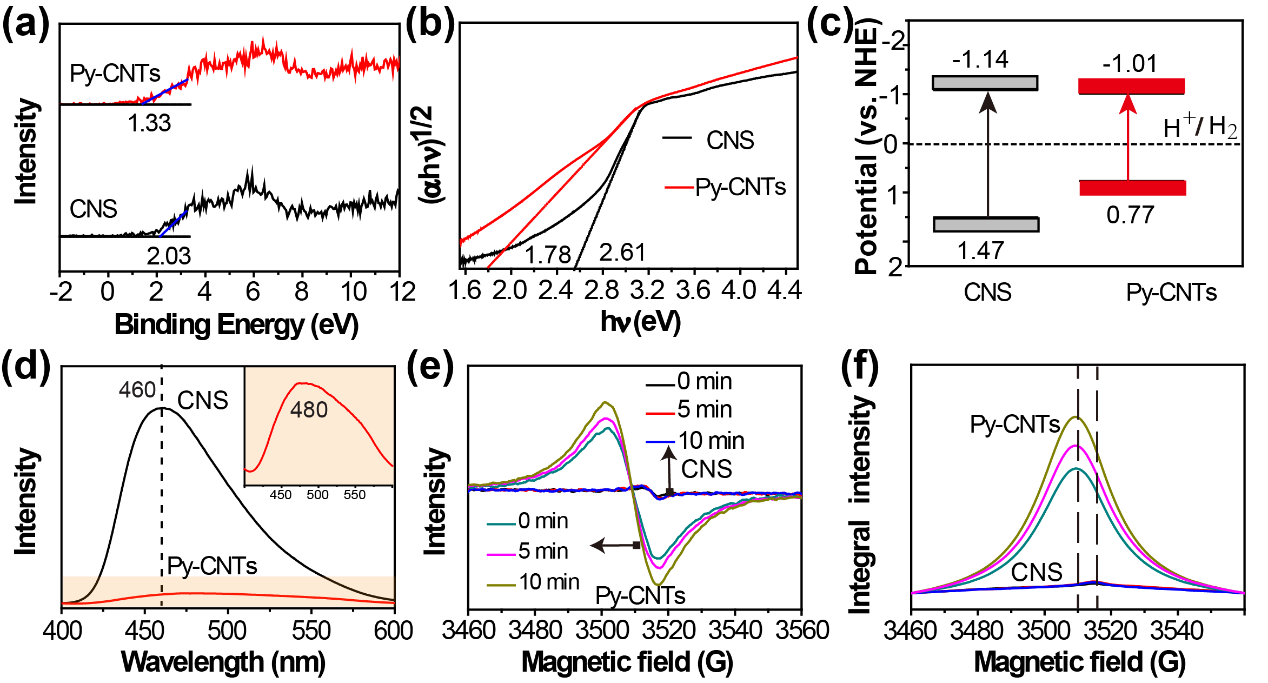 图4 (a) 氮化碳纳米片和富含吡啶的氮化碳纳米管的VB-XPS谱图和(b) Tauc 图。 (c) 氮化碳纳米片和富含吡啶的氮化碳纳米管能带结构示意图。氮化碳纳米片和富含吡啶的氮化碳纳米管的(d) 氮化碳纳米片和富含吡啶的氮化碳纳米管的稳态PL图、(e) EPR图和 (f) EPR曲线积分图。