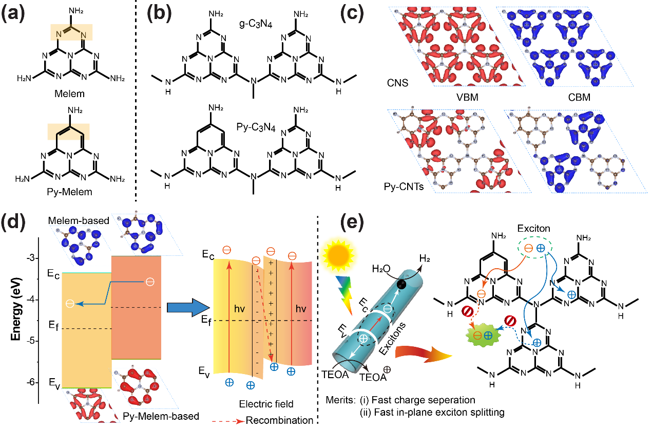 图5 (a) melem和Py-melem的分子结构示意图。(b) 氮化碳和富含吡啶的氮化碳的共轭聚合物的示意图。(c) 氮化碳和富含吡啶的氮化碳的VBM 和 CBM 分布。 (d) 左图: melem基聚合物和Py-melem基聚合物通过计算得到的能级位置及VBM和CBM。右图:形成同质结之后的能带结构调节示意图。 (e) 光催化性能提高的可能机理。