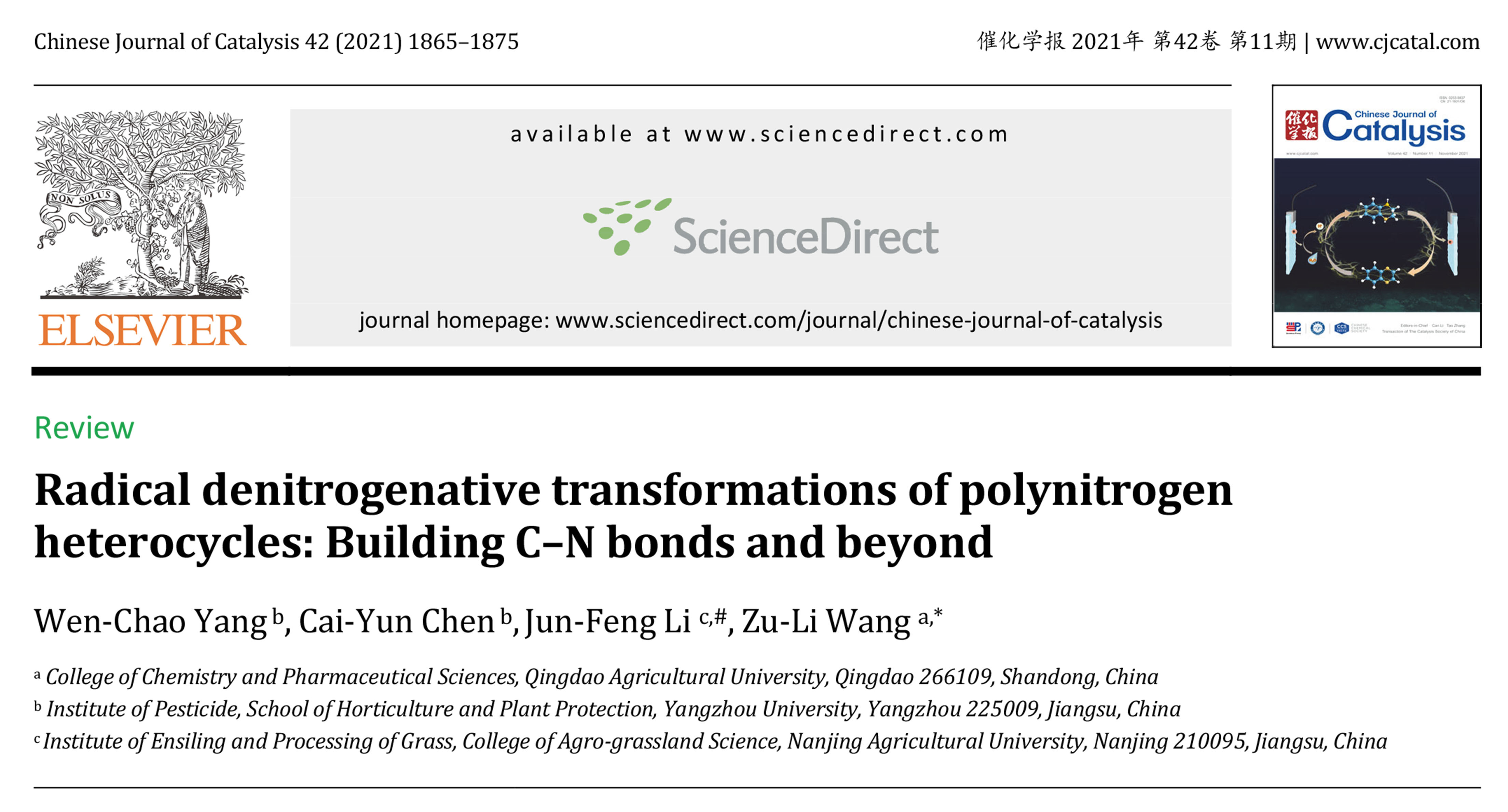 近日,王祖利副教授团队受邀请在中科院一区TOP期刊Chinese Journal of Catalysis《催化学报》发表了在多聚氮杂环的脱氮自由基转化: C−N键的构建领域的最新综述文章,并被编辑在微信公众号“催化学报CJCatal”等中外媒介推广。该工作综述了多聚氮杂环的脱氮自由基转化(C‒N键的构建)领域的最新进展, 重点讨论了脱氮生成自由基的方法与串联模式和反应机理, 分析了存在的挑战。论文通讯作者为王祖利副教授,青岛农业大学为第一单位。