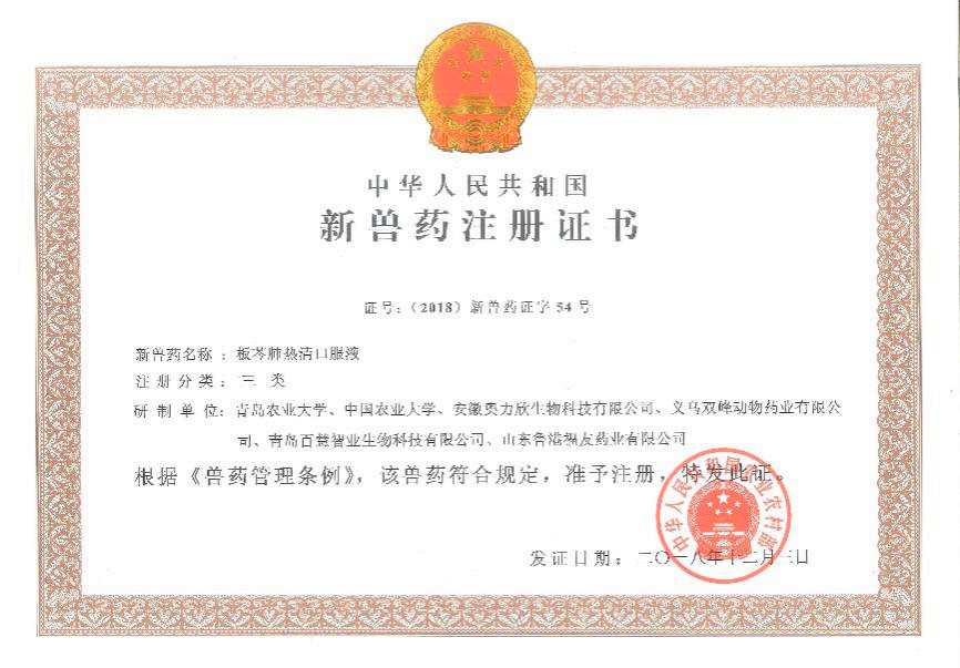 近期,太阳成集团tyc234cc郝智慧教授团队在新兽药研制方面的研究又添新成果。农业农村部发布第94号公告发布了青岛农业大学主持首位完成的研究成果“板芩肺热清口服液”获批国家三类新兽药并成功转化,该新药监测期3年,公告并发布产品质量标准、说明书和标签。