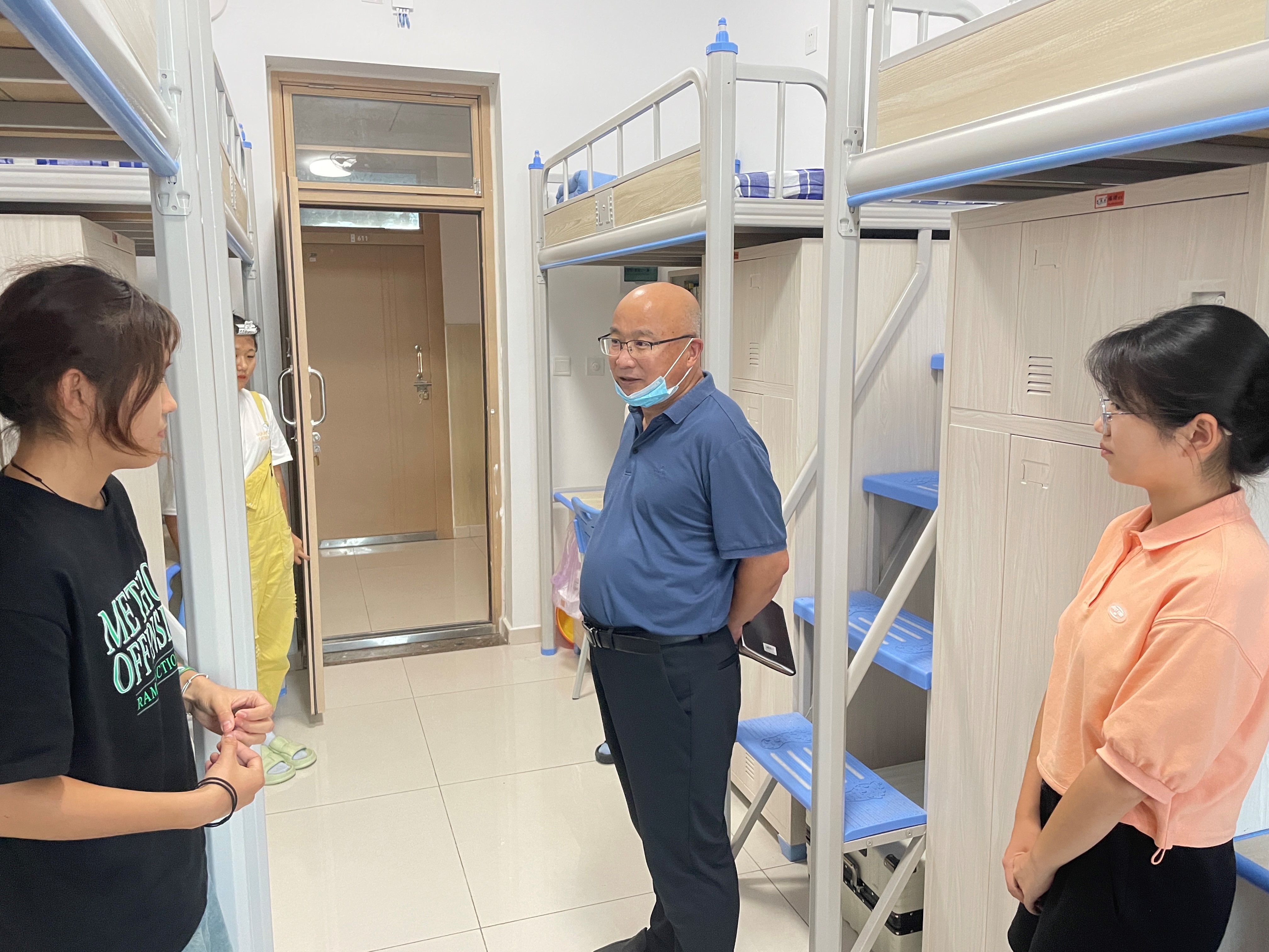 学院领导、辅导员老师走访学生宿舍,仔细查看宿舍内务整理、卫生安全以及通风消毒等情况。在走访中,学院领导就返校学生的思想状况、学习生活、宿舍安全等方面与学生进行了深入细致的交流,并强调在疫情防控常态化期间,要高度重视宿舍的安全和卫生,保持宿舍干净整洁,做好个人卫生防护。同时,也鼓励同学们养成良好的学习习惯,明确学习目标,以良好的精神状态开启新学期。