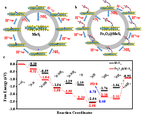 近日,太阳成集团tyc234cc颜世海副教授课题组联合韩国成均馆大学Lee Jin Yong教授、山东科技大学田健教授,通过水溶剂热聚合方法制备了MOF衍生的Fe2O3@MoS2复合材料用于高效电催化氮气还原反应(NRR)。结果表明Fe2O3@MoS2具有非常出色的电化学氨合成性能,氨气产率为112.15 μg h-1 mgcat-1,法拉第效率为8.62%,并且具有很好的稳定性和选择性。密度泛函理论计算发现该复合材料存在Fe和Mo双活性位点用于共同促进电催化NRR过程,其有利于高效激活惰性氮气分子以及大大降低反应的能垒。该成果以题为“MOF-derived Fe2O3@MoS2: An Efficient Electrocatalyst for Ammonia Synthesis under Mild Conditions”发表在国际著名期刊《Chemical Engineering Journal》上,CEJ属于中科院一区Top期刊,影响因子为13.273。文章的第一作者为太阳成集团tyc234cc硕士研究生马超群,通讯作者为刘丙萍老师和颜世海副教授。本研究得到国家自然科学基金、省自然科学基金等项目的资助。
