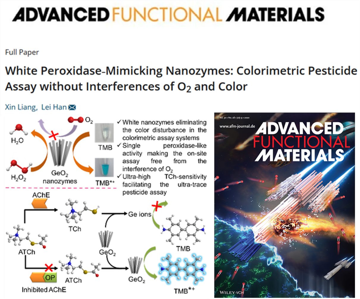 近期,太阳成集团tyc234cc硕士研究生梁欣以第一作者身份(导师韩磊教授为通讯作者)在化学与材料领域权威学术期刊Advanced Functional Materials(影响因子16.836)上发表了题为“White Peroxidase-Mimicking Nanozymes: Colorimetric Pesticide Assay without Interferences of O2 and Color”的研究论文(Adv. Funct. Mater. 30(28), 2001933, DOI: 10.1002/adfm.202001933),报道了一种巯基胆碱敏感的白色单活性纳米酶及其在农药可视化检测上的应用(图1)。该项研究解决了纳米酶主要亚家族仿过氧化物酶的自身氧化酶活性及颜色的干扰,为基于生物酶和纳米酶的比色分析系统的超敏度、抗干扰等性能的改善提供了新思路;所制备的新型纳米酶的诸多特性及性能优势使其具有用于农药现场快速检测的潜力,在农药可视化分析领域展现出了良好的应用前景。由于研究成果的新颖性和重要性,该工作被Advanced Functional Materials编辑选为当期的Inside Front Cover(图1)。本研究得到国家自然科学基金、山东省科技计划项目等项目的资助。