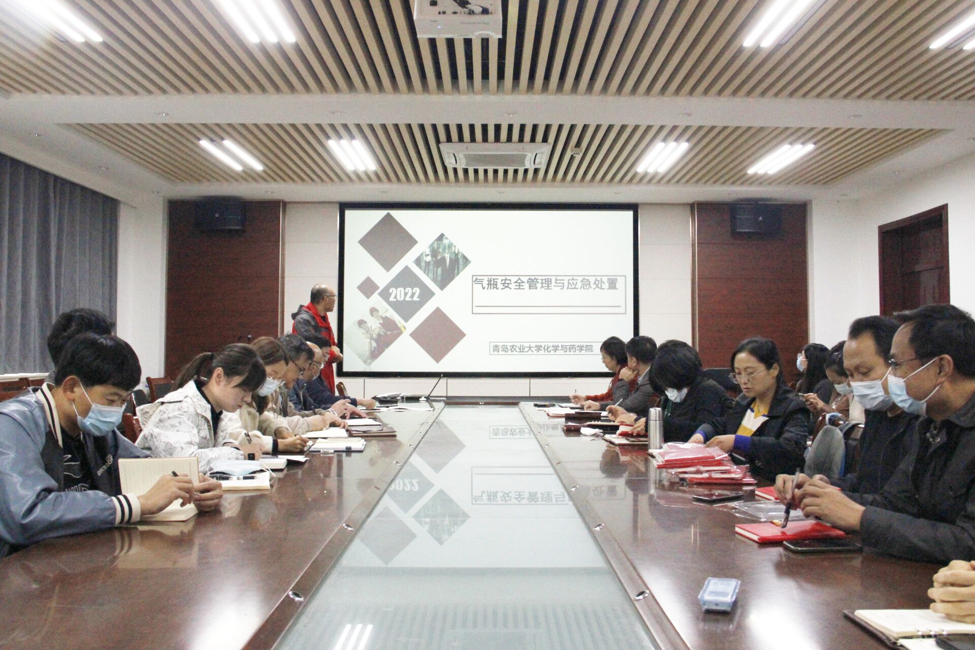 本次培训从气瓶危险源及其辩识、气瓶规范使用管理以及气瓶事故的应急处理三个方面展开。培训会上,王强详细介绍了第一、第二类危险源以及危险源的辩识,通过讲述气瓶基础知识以及气瓶搬运、使用、储存中的注意事项,要求全体教职工要注意使用、储存等过程中的行为规范,避免危险发生,并针对乙炔气瓶事故的紧急处置做出介绍。王强强调,患生于疏忽,祸起于细微,全体教职工要提高实验室安全意识,严格遵守安全规范,守好实验室安全底线。
