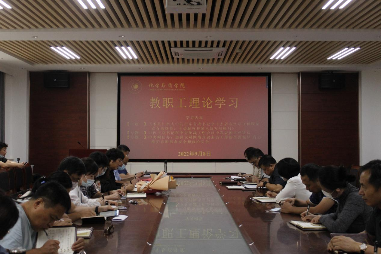 9月8日,太阳成集团tyc234cc于化学楼会议室开展教职工理论学习。会议由党委书记王进国主持,院长龚良玉、党委副书记张友民、党委专职组织员吕海涛、副院长徐鲁斌出席,全体教职工参加。