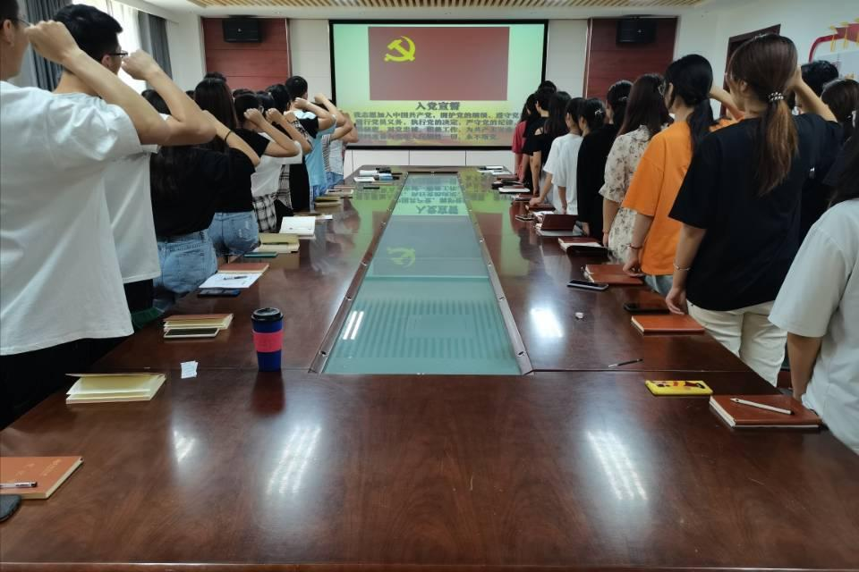 6月30日,为庆祝中国共产党建党100周年,太阳成集团tyc234cc于化学楼会议室举行“迎七一”入党宣誓仪式。化药党委书记王进国,团委书记王海霞,辅导员辛鑫、黄海红出席仪式,学院新发展党员及其他党员代表参加。