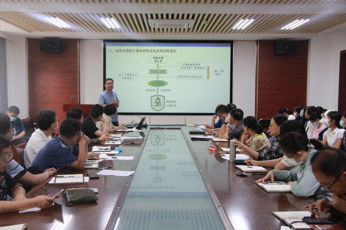 会上,张保华围绕碱蓬来源微生物,从课题研究背景、碱蓬来源微生物多样性及其农用活性潜力、当前碱蓬来源微生物研究进展展开讲解,并就碱蓬来源微生物在服务盐碱地生态发展反面的重要价值进行了阐述。张保华指出,保护黄河流域是事关中华民族伟大复兴的千秋大计,其所在的绿色农药创制与评价团队积极响应学校服务黄河流域生态保护和高质量发展的战略规划,聚焦黄河三角洲滨海盐碱地相对恶劣土壤环境下,如何实现农作物病虫害及杂草生态绿色防控的关键瓶颈问题,探索利用生防微生物助力盐碱地的提质增效,从滨海盐碱地蕴藏的独特微生物资源入手,建立滨海盐碱地滩涂来源生防微生物资源库,实现“取之于盐碱地,用之于盐碱地”。