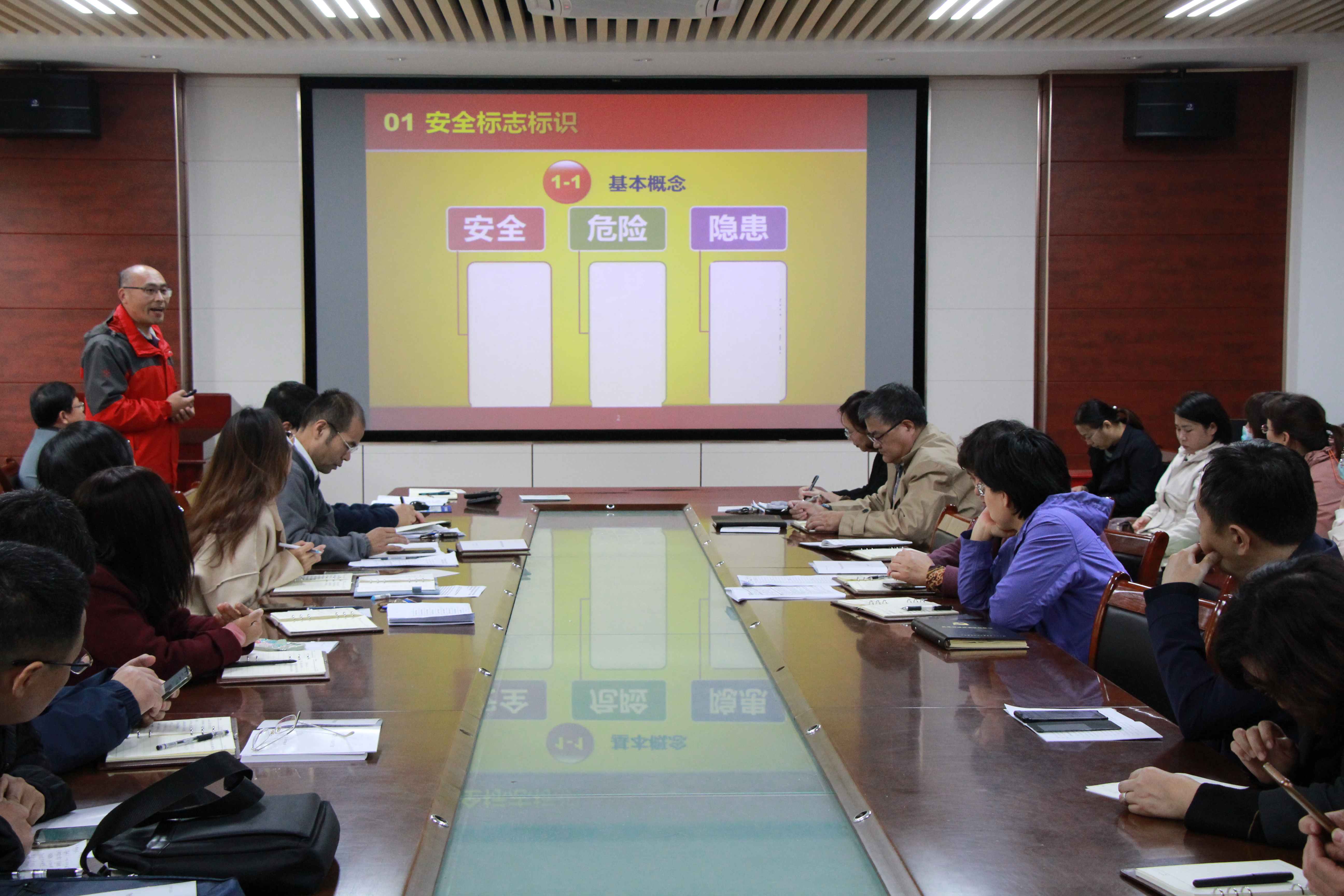 王强从常见的实验室安全标志、安全标志设置规范、实验室安全注意事项三个方面展开此次报告。会上,王强为与会教职工介绍了常见实验室安全标志的分类及具体含义,指出实验室安全标志标识设置的必要性和重要性,并结合学校对实验室管理的相关要求,详细讲解了实验室安全标志设置规范和实验室安全注意事项等内容,引导广大教职工学习安全知识,提升安全意识。