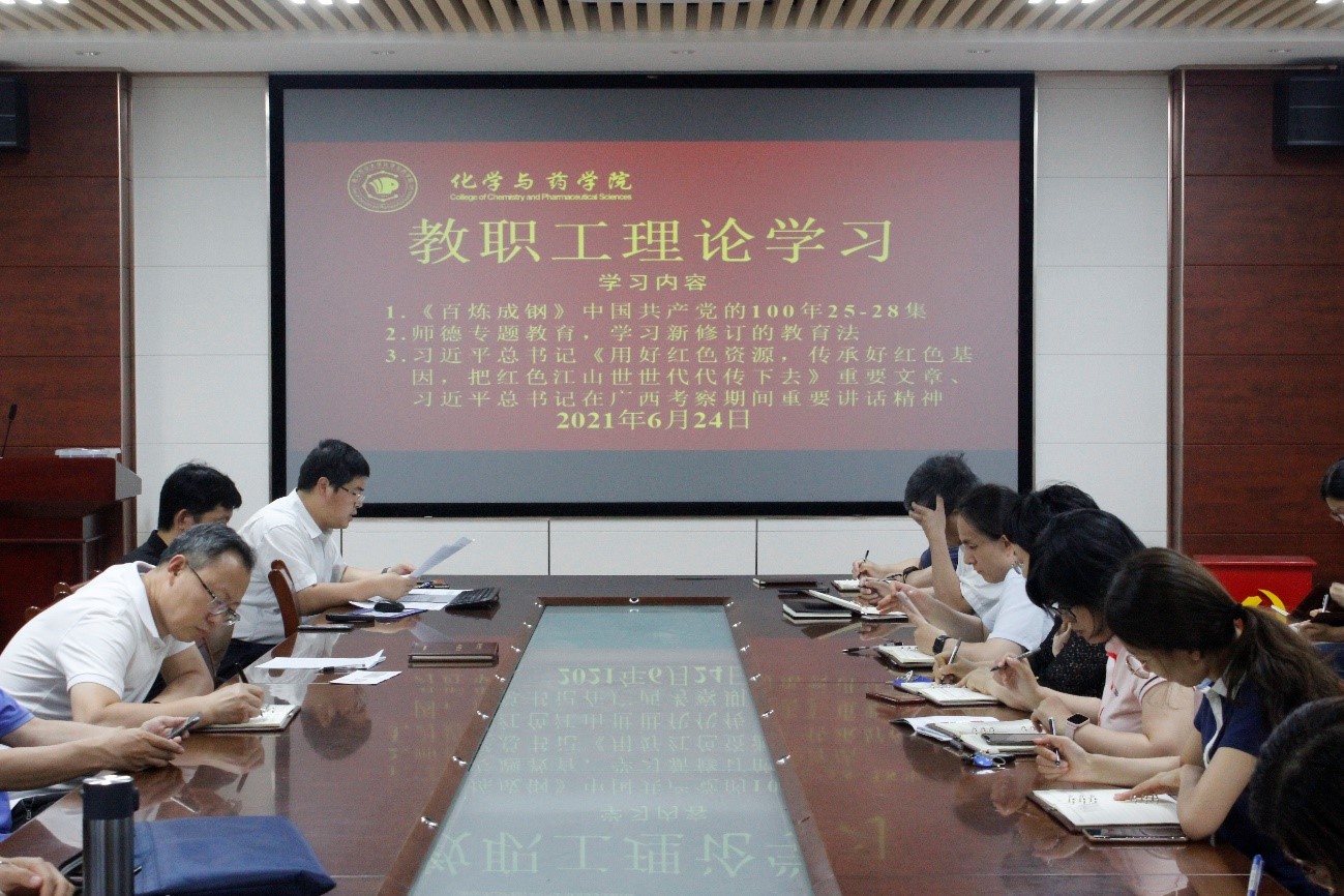 6月24日,太阳成集团tyc234cc于化学楼会议室开展教职工理论学习。会议由学院党委书记王进国主持,党委副书记史雪辉、党委专职组织员吕海涛出席会议,全体教职工参会。