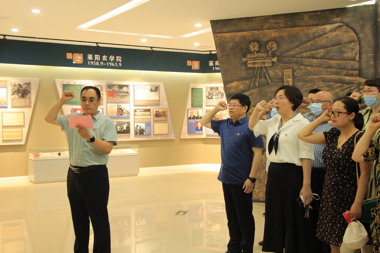 走进校史馆,一张张照片,一排排奖章映入眼帘,它们静静诉说着青岛农业大学70年来的风雨历程。成绩背后,是一代代党员同志坚持初心,不懈努力的成果。学院教师纷纷表示,通过参观校史馆,深刻感受到学校深厚的历史底蕴和老一辈开拓者的的人格魅力,进一步加深了对学校的认同感、归属感和自豪感。最后,在学院党员代表王修中的带领下,全体党员面向鲜红的党旗,共同高举右拳,庄严宣誓,铿锵有力的宣誓,展现了大家对党的无限忠诚、热爱和听党话、跟党走的坚定决心。铮铮誓言,跨越百年,拳拳初心,薪火相传。