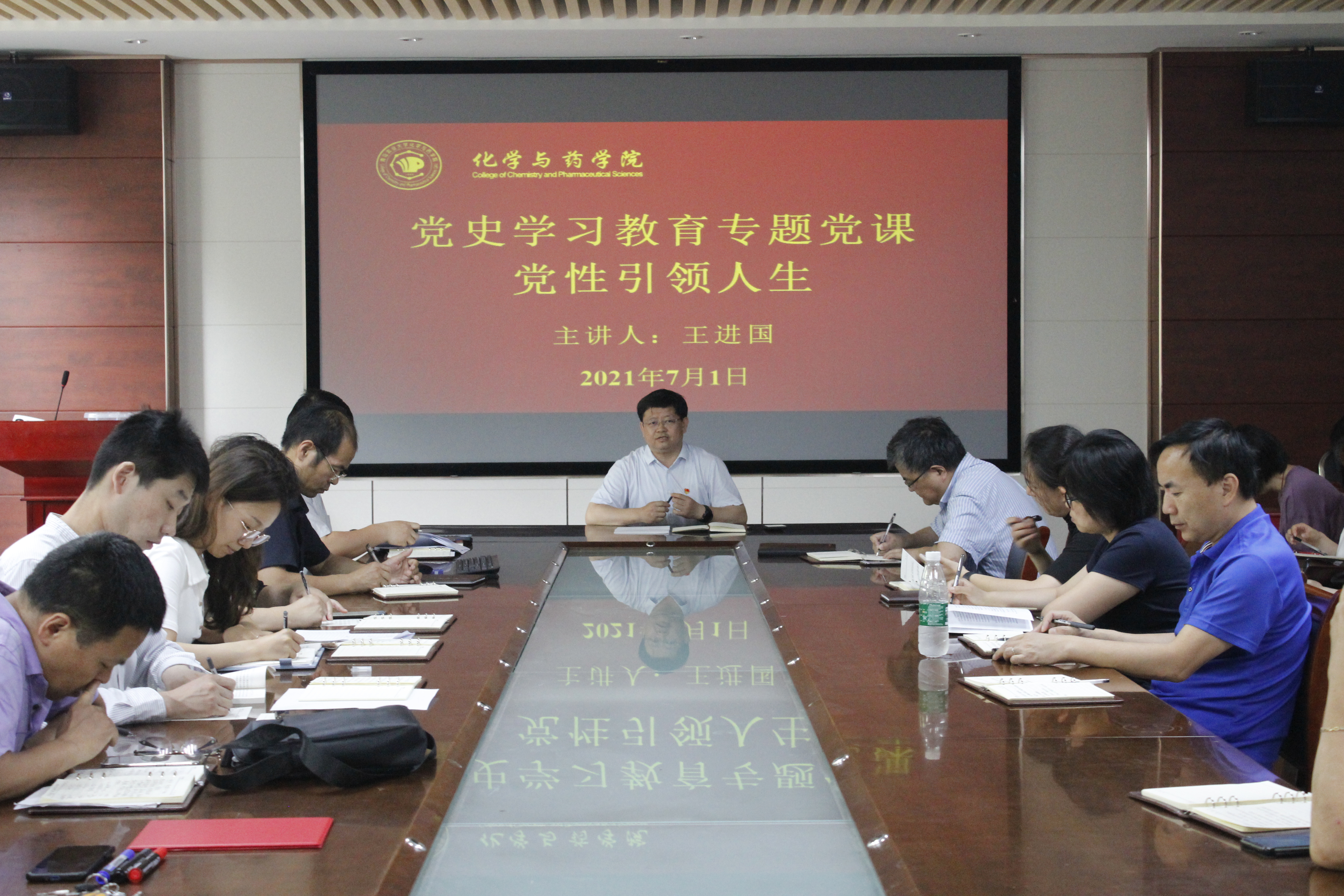 7月1日,迎接中国共产党百年华诞之际,太阳成集团tyc234cc于化学楼会议室开展党史学习教育专题党课,学院党委书记王进国为学院教职工讲授以“党性引领人生”为主题的专题党课,学院党委副书记史雪辉、专职组织员吕海涛、副院长郝双红出席会议,学院全体教职工参加。