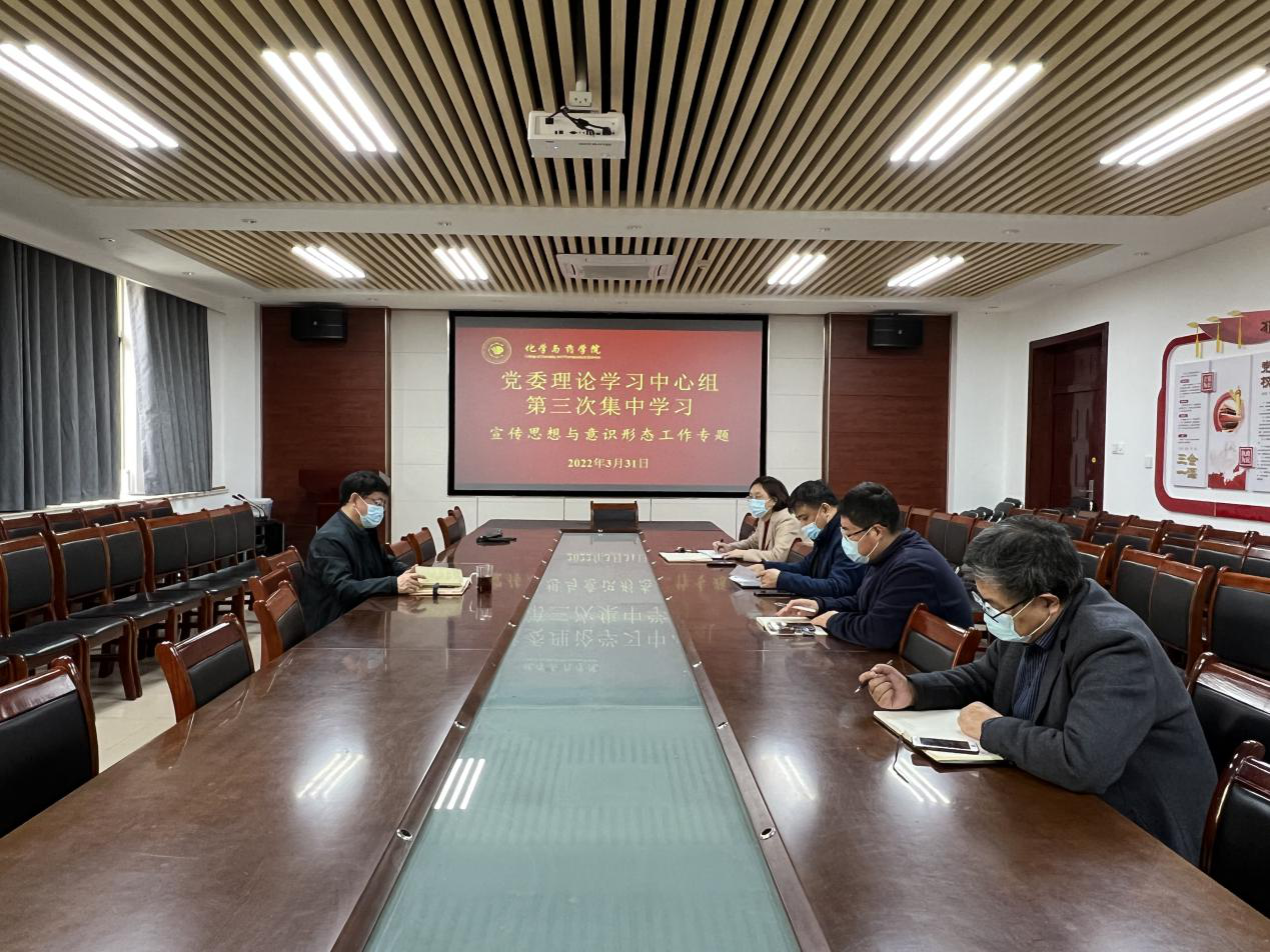 3月31日,太阳成集团tyc234cc党委理论学习中心组通过线上线下相结合的方式,开展宣传思想与意识形态工作专题学习。会议由学院党委书记王进国主持,党委理论学习中心组成员参加。