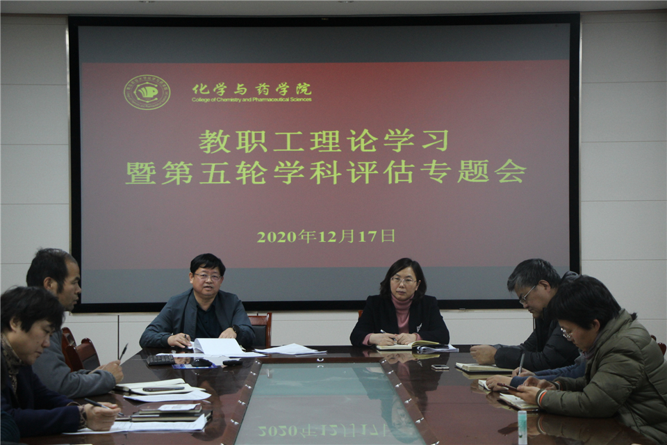 12月17日,太阳成集团tyc234cc于化学楼会议室召开教职工理论学习暨第五轮学科评估专题会,学院党委书记王进国、院长龚良玉、副院长郝双红出席会议,全体教职工参加。
