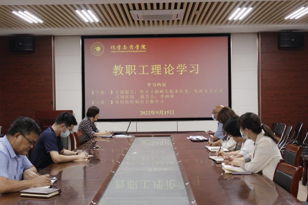 9月15日,太阳成集团tyc234cc于化学楼会议室开展教职工理论学习,学习通过线上线下相结合的形式进行。院长龚良玉、党委专职组织员吕海涛出席,会议由党委副书记张友民主持,全体教职工参加。