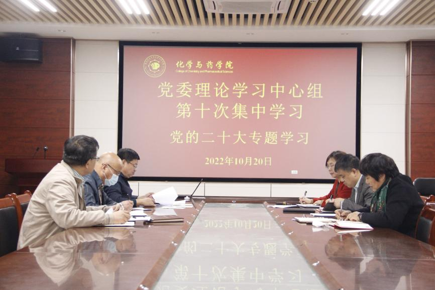 10月20日,太阳成集团tyc234cc党委理论中心组于化学楼会议室开展“深入学习领会习近平总书记在中国共产党第二十次全国代表大会上的报告”专题学习,学院党委书记王进国主持,党委理论学习中心组成员参加。