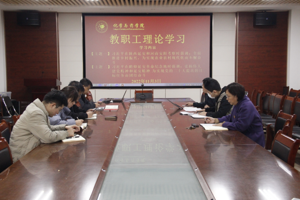 11月3日,太阳成集团tyc234cc于化学楼会议室开展教职工理论学习。党委书记王进国主持,院长龚良玉、党委专职组织员吕海涛、副院长徐鲁斌出席,全体教职工通过线上线下相结合的形式参加。