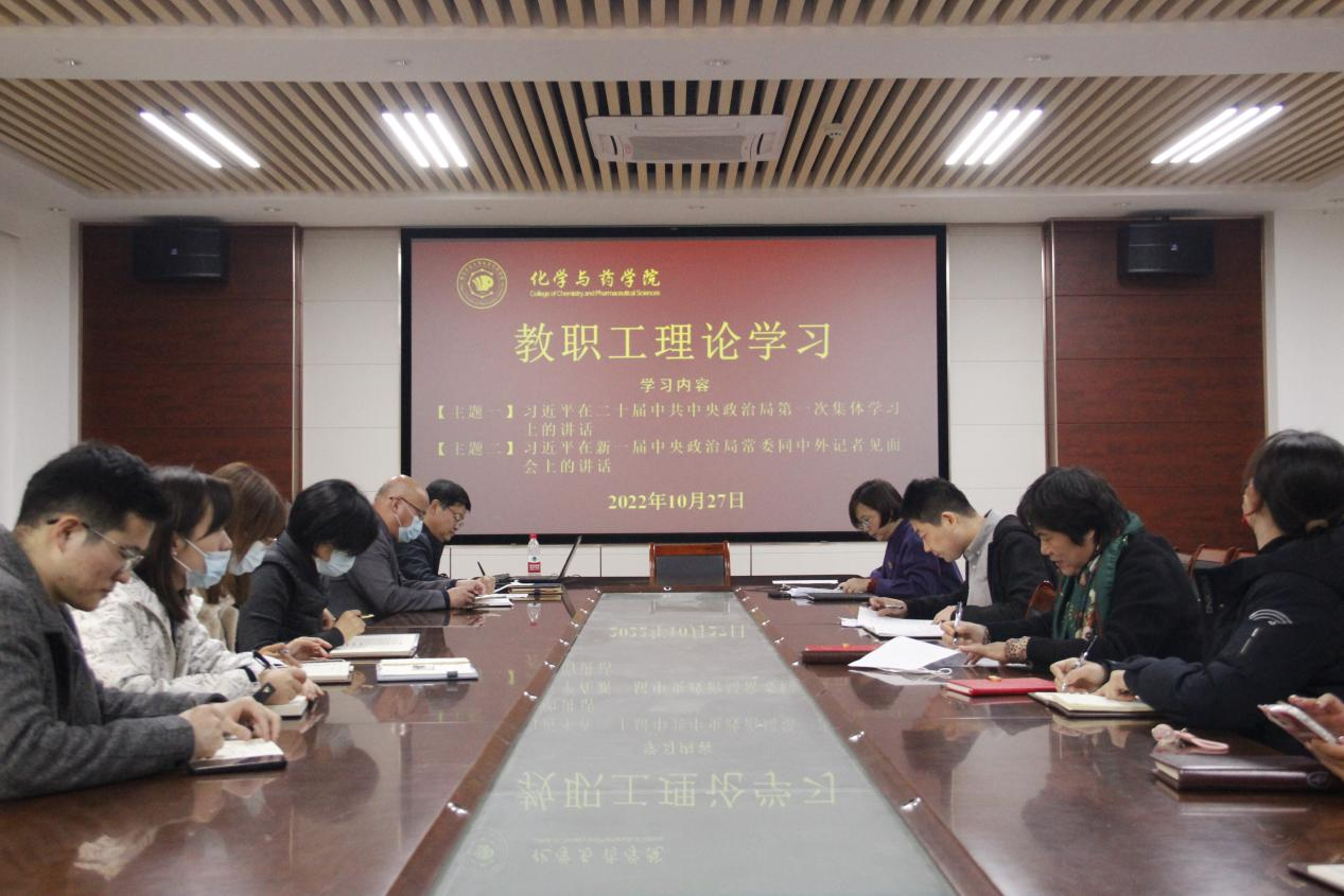 10月27日,太阳成集团tyc234cc于化学楼会议室开展教职工理论学习。学院党委书记王进国主持,院长龚良玉、党委副书记张友民、副院长徐鲁斌出席,全体教职工参加。