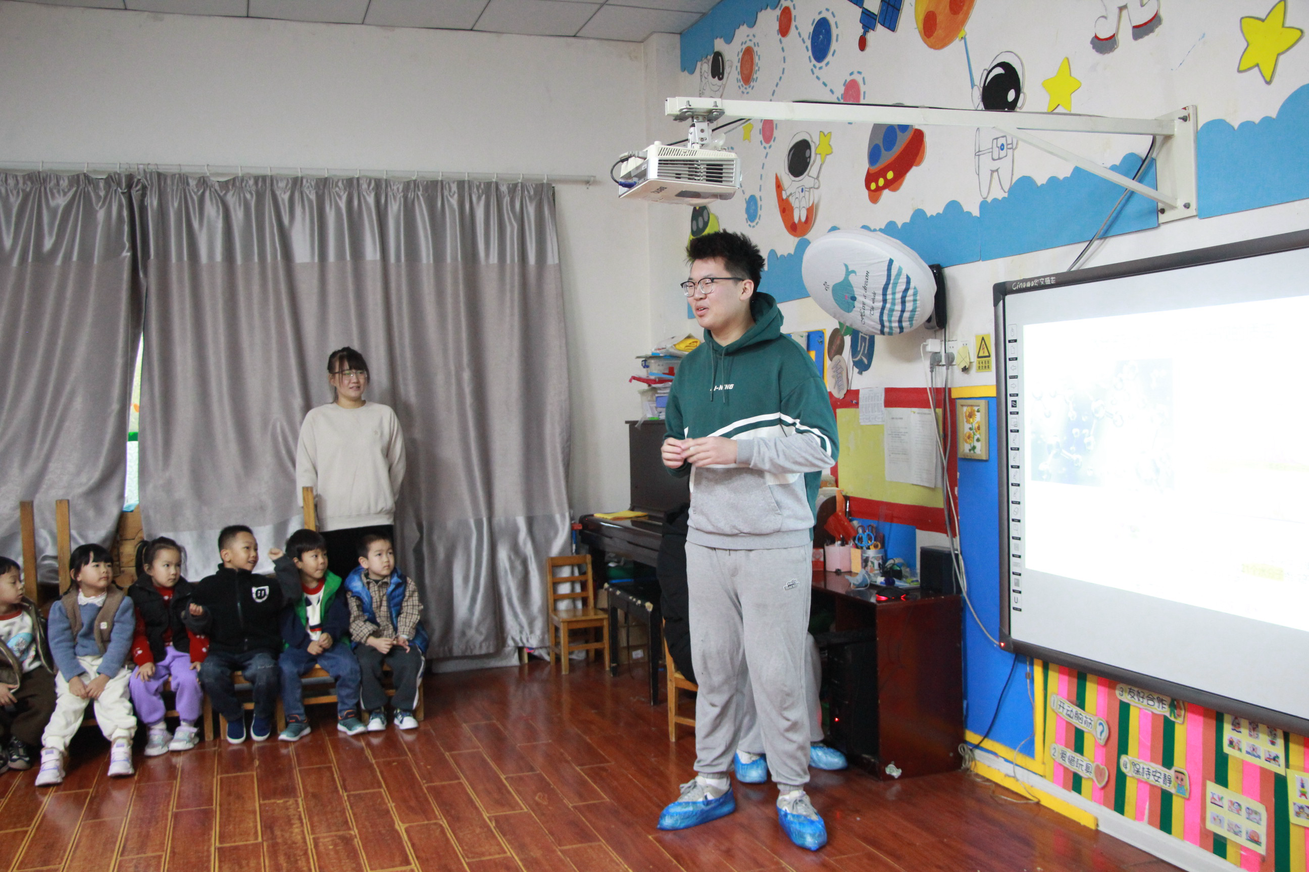 “大家长大后的梦想是什么呀?想要成为科学家吗?”“我们每天为什么要喝水呀?”志愿者宿佳琪、王俊翔通过课件展示,运用许多事例生动地向小朋友们讲述身体和生活中的化学科学知识,并耐心分析了日常生活中常见的化学现象。小朋友们的好奇心被激发出来,产生各种小疑问“老师,我们脑子里有什么呀?”“酸甜苦辣是化学反应出来的吗?”志愿者们一一解除了孩子们的困惑,孩子们对化学表现出浓厚的兴趣。