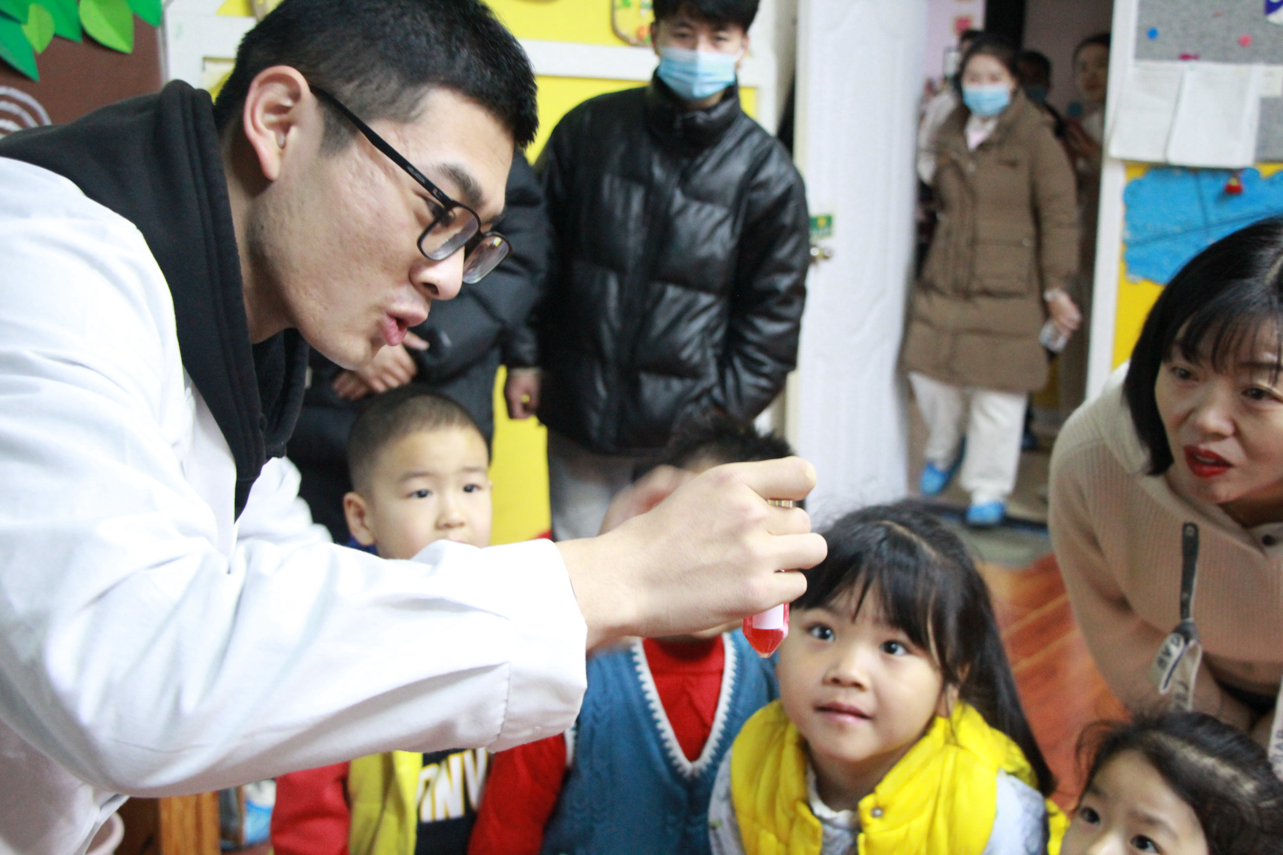 实验演示中,志愿者徐艳宁、刘海潮演示了“杯子火山爆发”趣味化学实验,“小朋友们做好板凳,瞪大眼睛,仔细观察杯子,见证化学魔法的时刻到了!”志愿者们轻声慢语地提醒道,“火山熔岩”一出现,引发了小朋友们诸多好奇心。随后,小朋友们被分成6个小组,每组在一位志愿者的辅助下,进行“沉浸式”化学魔法体验。