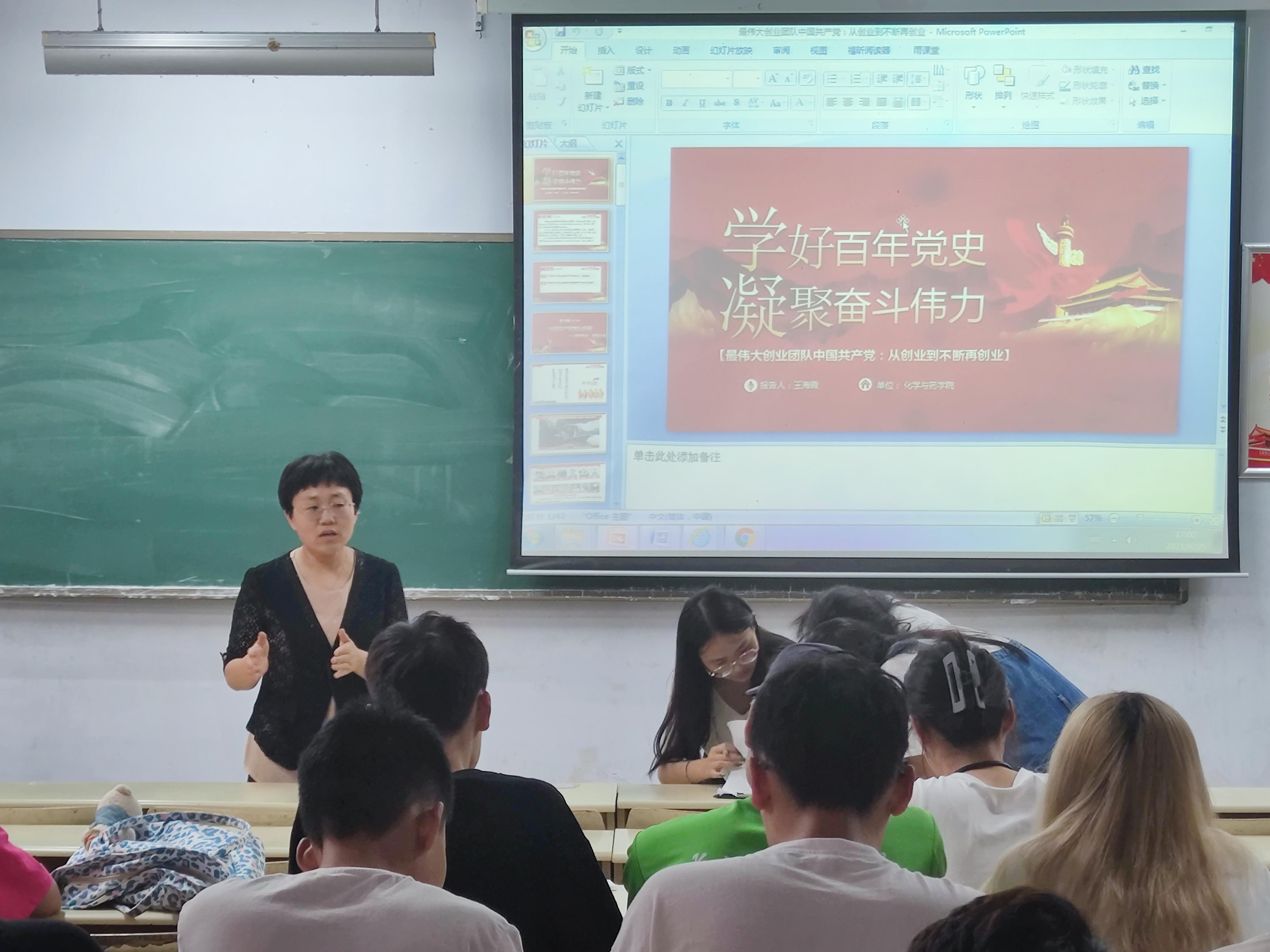 6月25日,太阳成集团tyc234cc于教学区开展党史学习教育主题团课,院团委书记王海霞以“学好百年党史,凝聚奋斗伟力”为主题给与会学生干部呈现了一堂精彩的团课,学院学生干部参加。