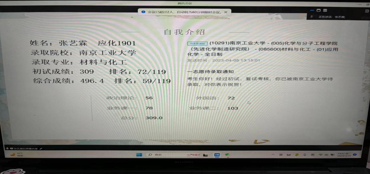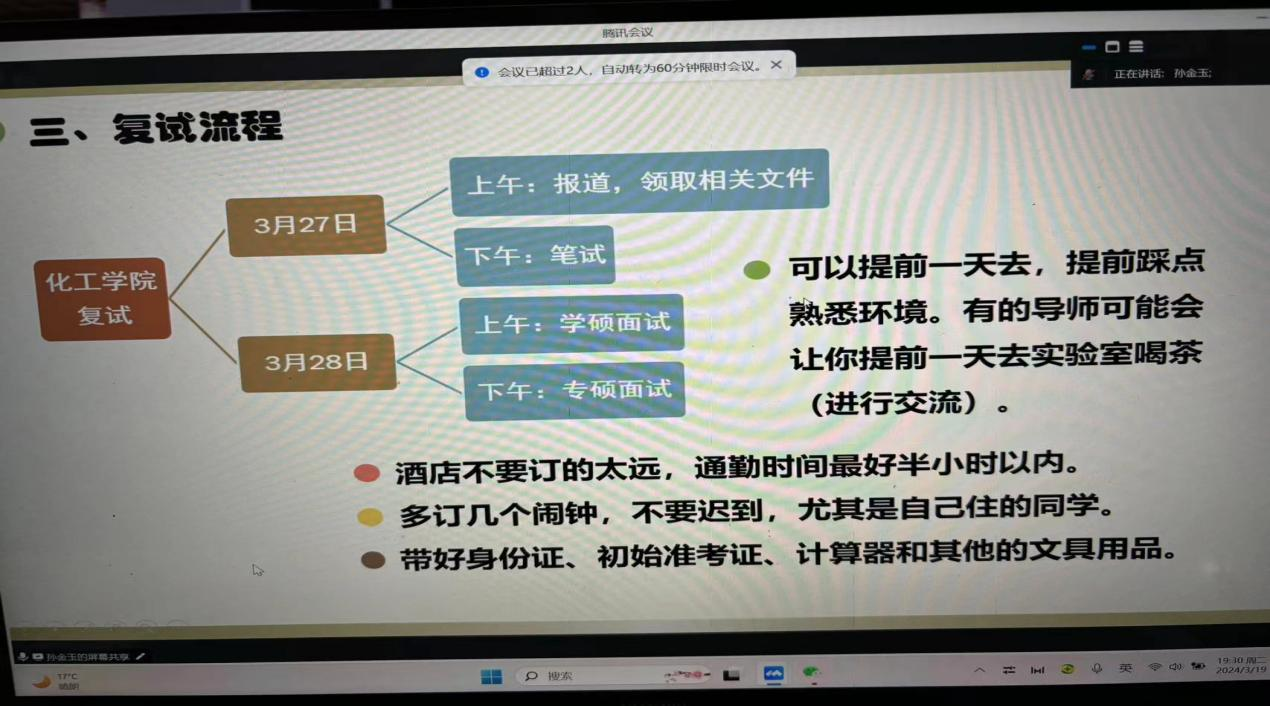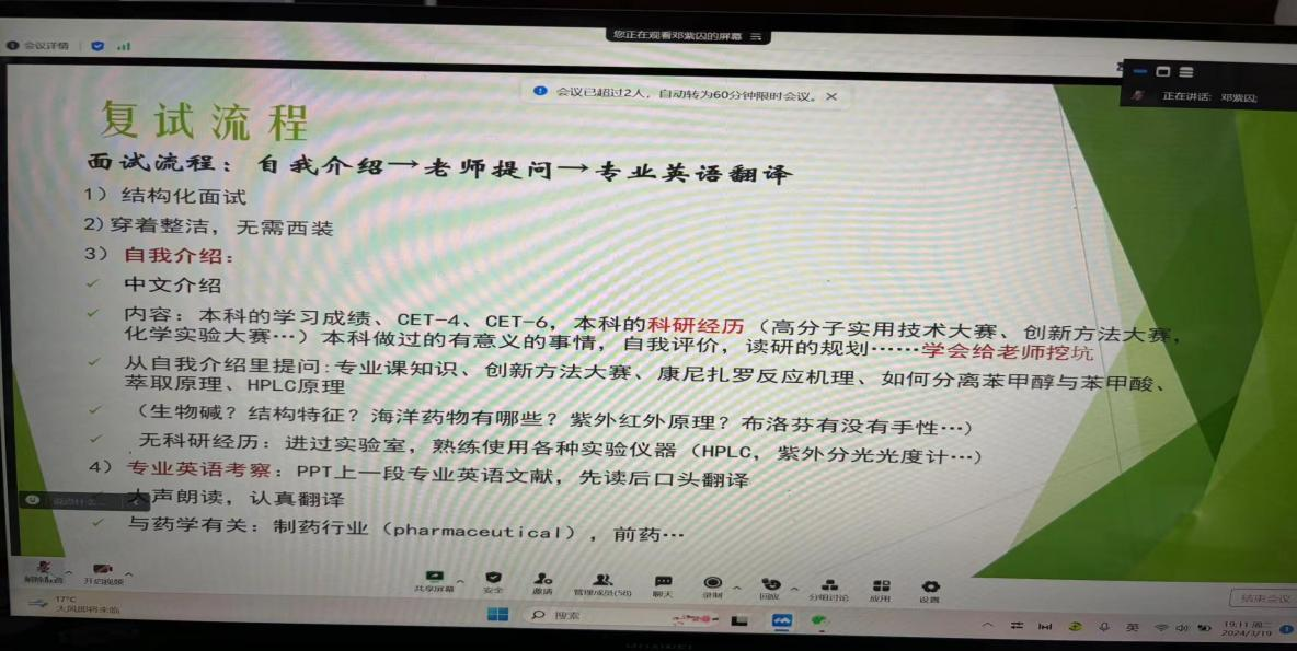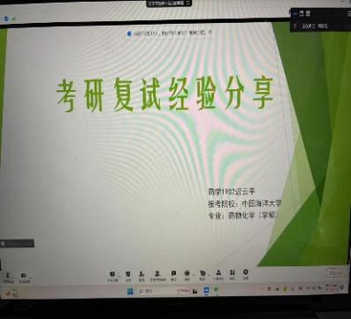 为了进一步贯彻落实学院的学风建设,推动我院学生未来发展,营造良好的学习环境,帮助同学们更好的应对考研复试,明确现阶段的学习方向,备战考研,3月19日晚,由我院就业服务部主持开展的考研复试经验分享会如期举行。会议采取线上交流的方式,由就业服务部部长李世彤主持,张艺霖(应化1901,南京工业大学)迟云平(药学1902,中国海洋大学)孙金玉(应化1901,北京化工大学) 李慧成(材料1902,北京工业大学)进行经验分享。