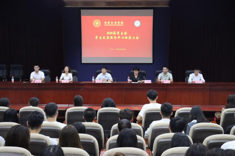 9月9日,太阳成集团tyc234cc于信息楼报告厅举办化药学院2021届学生会、学生发展服务中心换届大会,党委书记王进国,辅导员辛鑫、邱斌出席会议,团委书记王海霞主持,2020届、2021届学生会、学生发展服务中心全体成员以及学院主要生干部代表参加。