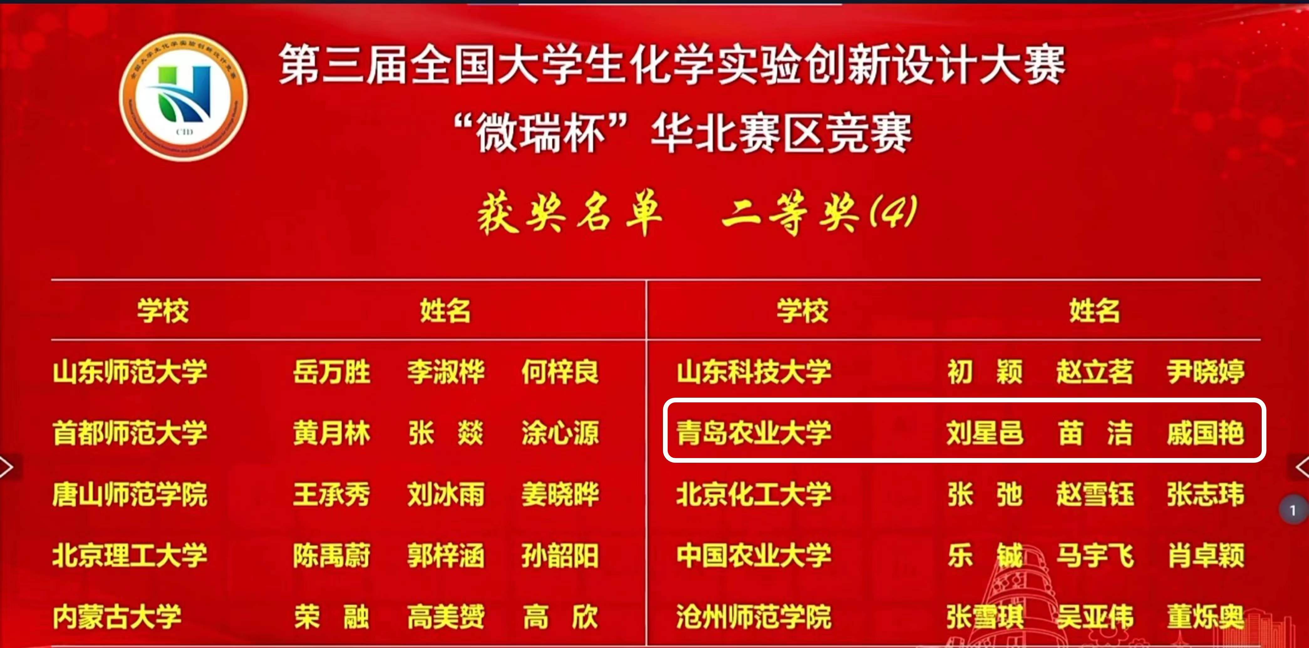 第三届全国大学生化学实验创新设计大赛华北赛区竞赛于2022 年7 月14 日-17 日在北京师范大学落下帷幕,我校首次参赛,选送三项作品,经过初赛,其中两项作品进入复赛阶段。复赛在北京师范大学(昌平校园)举办,参赛团队以作品和线上答辩相结合的形式比赛。经过充分准备、激烈角逐,我校《基于聚吡咯纳米线阵列双模式快速检测啶虫脒》、《变废为宝——查尔酮的选择性还原再利用》分别获华北赛区二、三等奖。