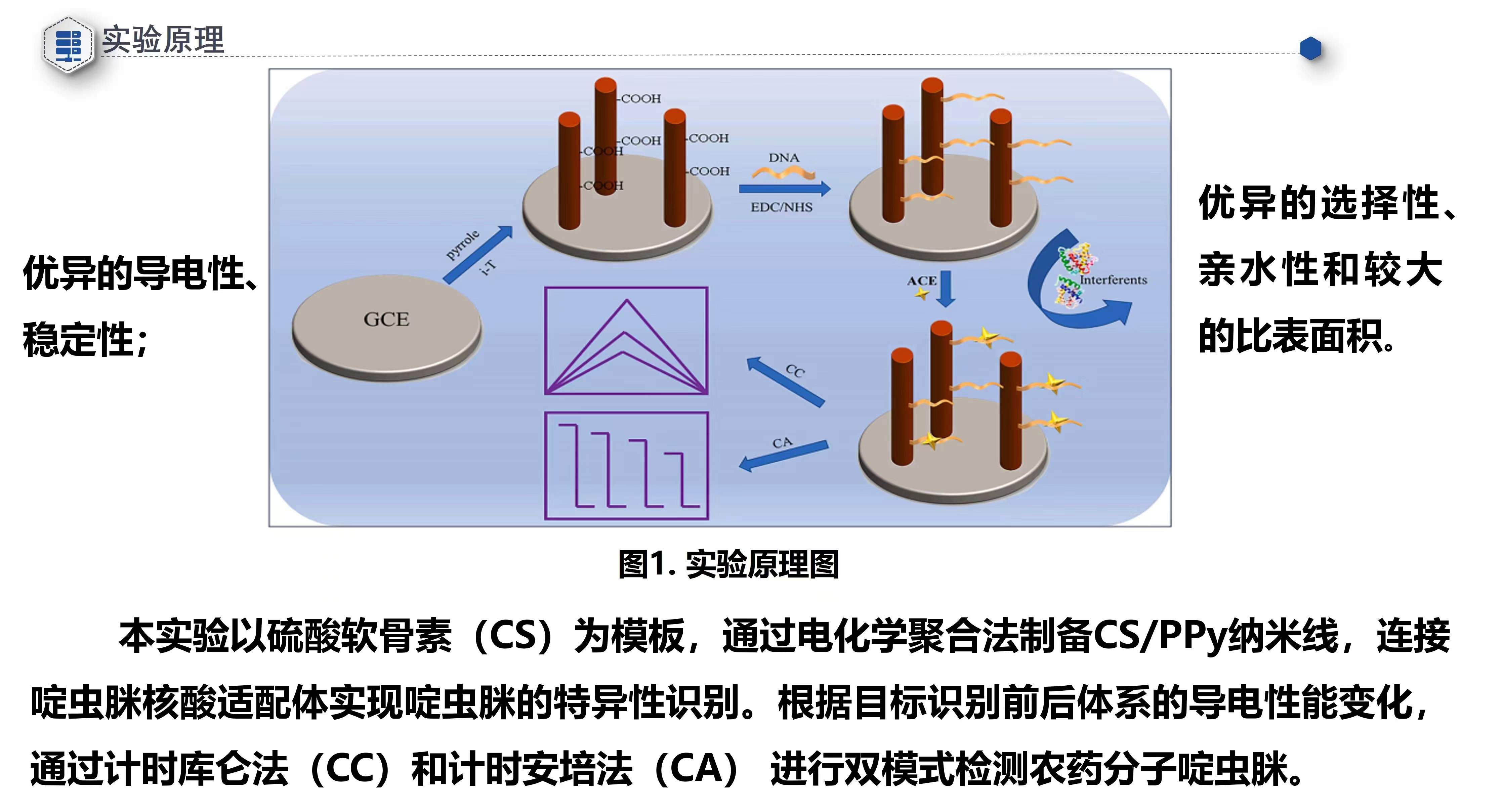作品《基于聚吡咯纳米线阵列双模式快速检测啶虫脒》由惠妮、王修中两位老师指导,刘星邑、苗洁、戚国艳三位同学完成。该作品基于硫酸软骨素掺杂的聚吡咯纳米线(CS/PPy)为基底开发了一个双模式检测农药啶虫脒残留的生物传感器,相较于高效液相色谱等方法,该生物传感器操作简单,特异性好,灵敏度高,成本低。实验包含纳米材料的制备及表征、固液界面化学研究以及实际样品中农药含量的检测等多个模块。与单模式方法相比,基于硫酸软骨素掺杂聚吡咯纳米线的双模式方法可以显著提高分析效率和准确度,通过更换相应的核酸适配体,还可以检测对应种类的农药分子,这为传感器在农药残留分析的应用和发展开辟了新的途径。本实验将制备纳米材料传感器引入本科实验,并将仪器分析实验与材料制备表征相结合。