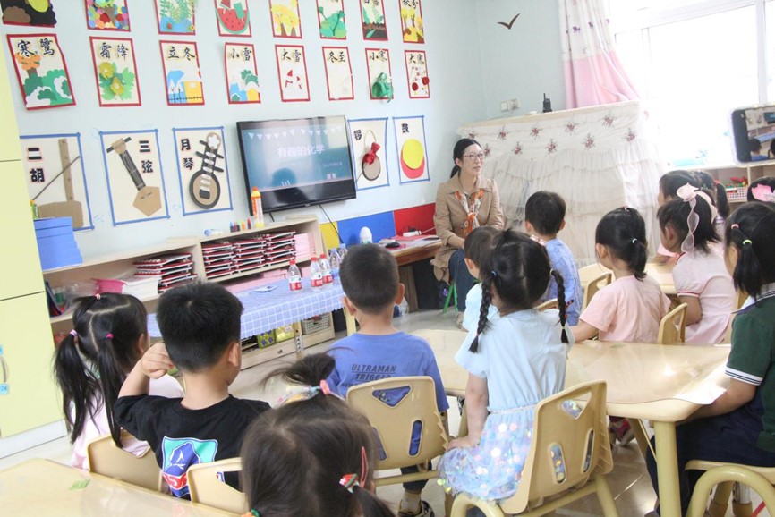 活动前期,宁静老师与团队成员围绕如何开展好科普活动展开讨论并确定活动流程,对此次活动进行了明确的分工。上午九点宣讲团来到康得乐幼儿园,活动在愉悦的上课铃声中拉开帷幕。首先由宁静老师进行科普知识宣讲,结合动画展示让小朋友们了解什么是化学、什么是反应以及生活中的化学现象,充分调动了小朋友的积极性。小朋友们对奇妙的化学反应及现象表现出极大的好奇,积极踊跃发表自己的想法,现场气氛十分热烈。