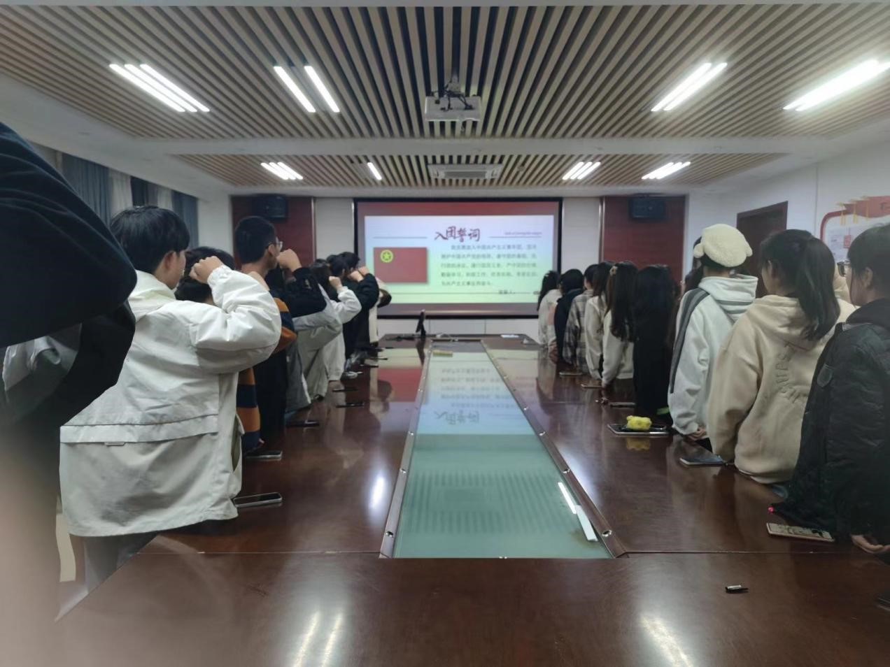 会议伊始,全体起立,奏唱国歌。团委书记赵莹宣读团章并宣布新团员名单,强调团组织的宗旨和团员的责任。随后,团委代表为新团员佩戴团徽并颁发入团证书。新团员们面向团旗郑重宣誓,参与仪式的师生纷纷为新团员们鼓掌喝彩。同时,团委书记赵莹对新团员提出希望和要求,希望新团员们能秉持团员精神,为学校的发展和社会的进步做出更大的贡献。