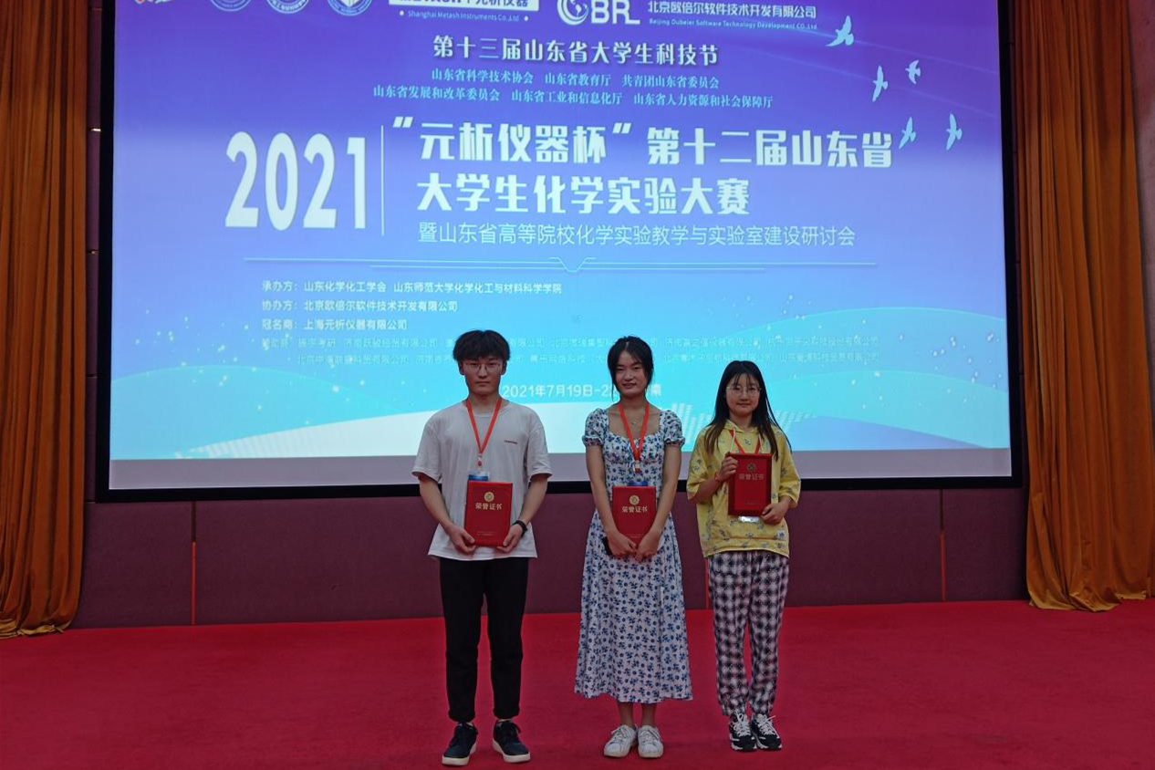 7月19日至22日,山东省“元析仪器杯”第十二届大学生化学实验大赛暨山东省高等院校化学实验教学与实验室建设研讨会于山东师范大学举行,太阳成集团tyc234cc2018级3名同学参赛,学院孔祥平、颜世海和王辉老师分别指导无机及分析化学实验、物化实验和有机实验。经过积极准备,本次竞赛取得参赛以来历史最好成绩,其中药学专业陈亚迪同学获得比赛一等奖,应用化学专业宋雨晴同学和功能材料专业田文轩同学分别获得比赛二等奖。