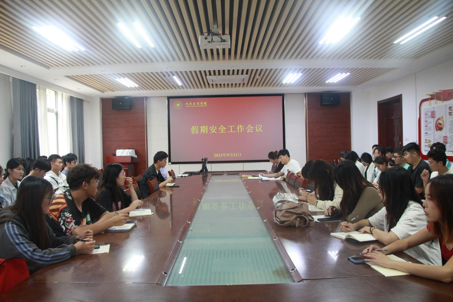 首先,会议对放假时间以及上课安排作出通知。随后,辅导员李鑫从交通安全教育、防溺水教育、防诈骗防传销教育、防自然灾害安全教育、食品卫生安全教育和学生公寓安全教育六个方面进行重点强调说明,强化学生安全意识。最后,会议对离校登记工作、宿舍安全管理以及中秋和国庆双节返校统计工作进行安排部署。