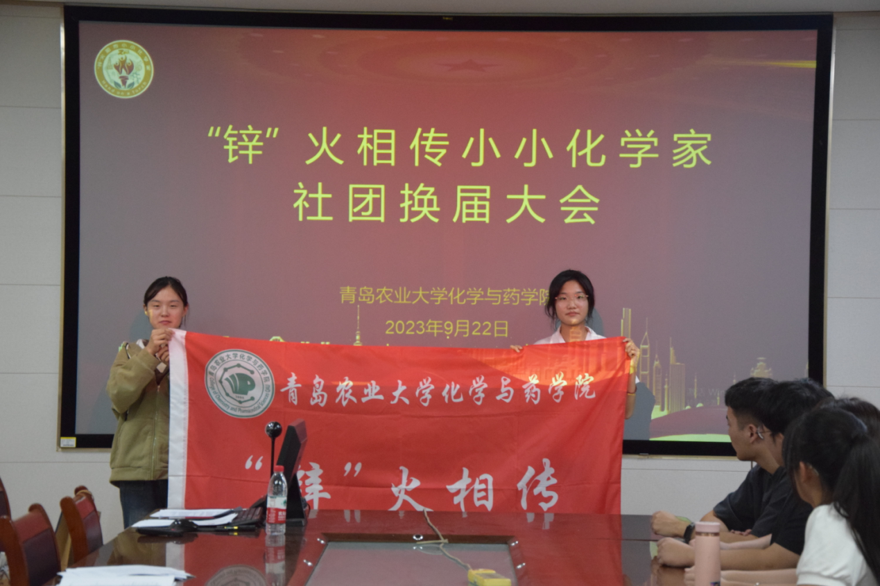 2022届会长郑美湘为2023届会长高丽颖授旗。高丽颖手中接过的不仅仅是一面旗帜、一份任务,更是社团代代相传的期望与“锌”火不灭的精神!