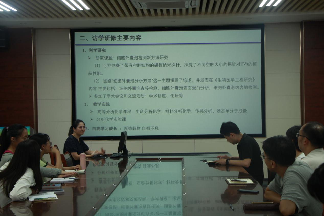 会议伊始,杨立敏首先介绍了此次清华大学访学研修的学科以及导师的基本情况。随后,杨立敏从科学研究、教学实践、自我学习成长三方面详细阐述了访学研修的主要内容,特别是参与的研究课题——“细胞外囊泡检测新方法研究”以及围绕这一课题所撰写的综述和在《生物医学工程研究》等权威期刊上发表的研究成果。杨立敏表示,在访学期间清华大学浓厚的学风以及严谨的学术氛围令人深受启发,作为学者应该不断追求学术上的精进与创新,希望全院师生能够积极向上,勤奋刻苦,勇于探索,营造良好学风,为学院的学术发展贡献自己的力量。