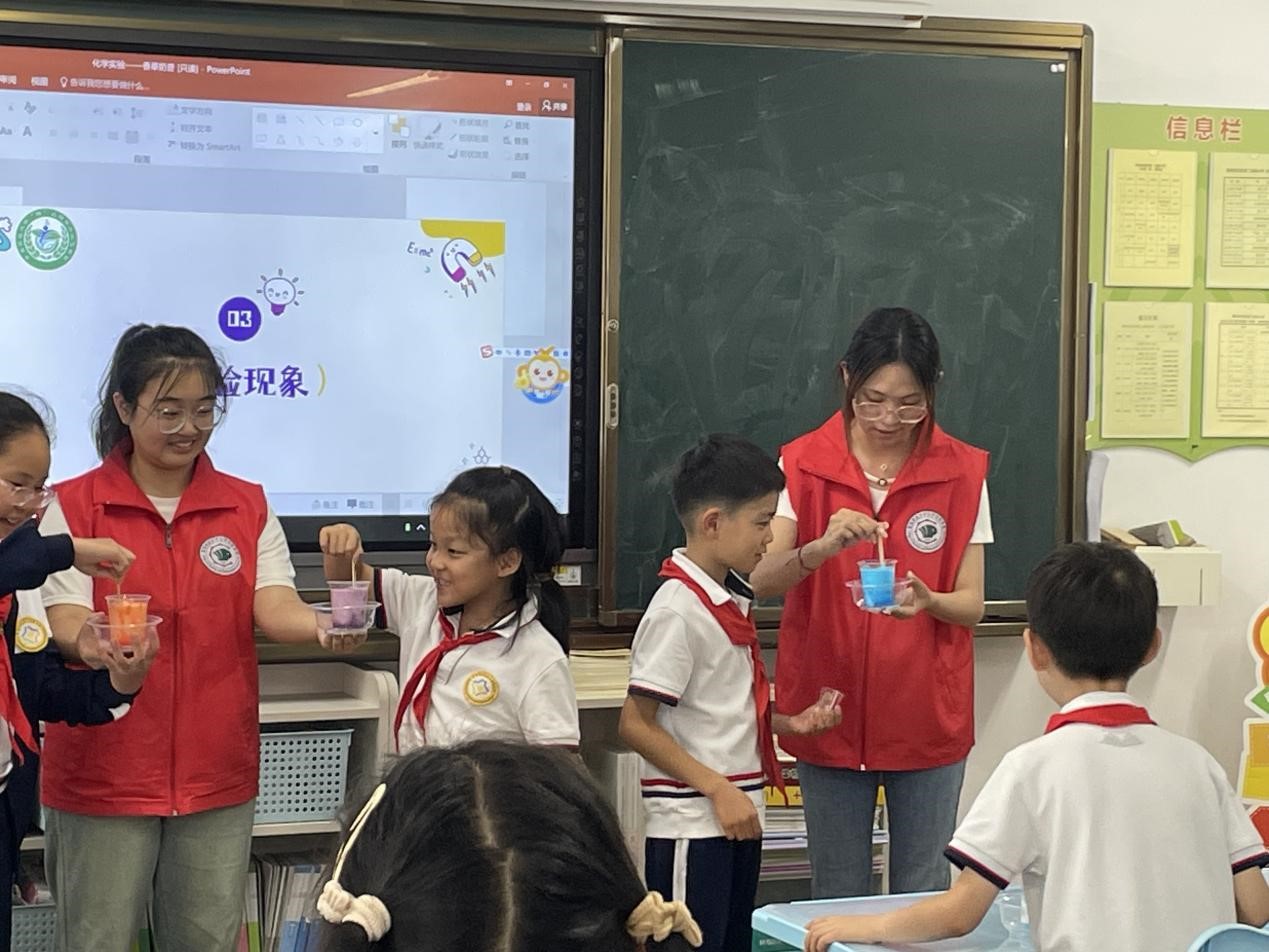 为了进一步加深小学生们对化学的理解,提高他们的动手能力,青岛农业大学“锌”火相传小小化学家社团的成员王瑶带领孩子们进行了“香草奶昔”化学实验。她详细演示并解释了实验步骤。随着实验的进行,彩色泡沫喷涌而出的奇妙景象让孩子们惊喜连连。在志愿者王瑶、孙梦媛和王新宇的指导下,孩子们分组进行动手实验,每个孩子都积极参与,认真学习实验原理,深刻体验化学的神奇与魅力。