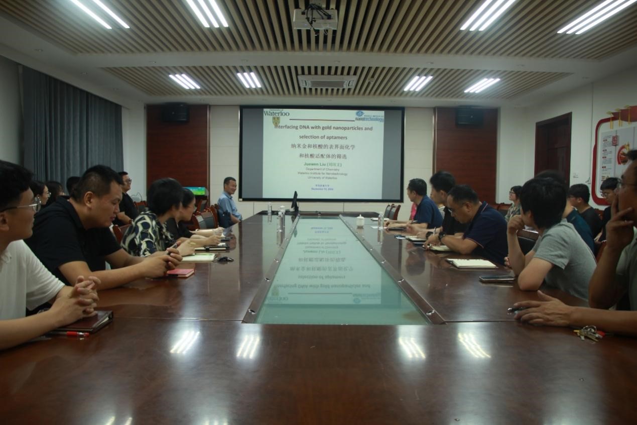 9月12日,太阳成集团tyc234cc“化学+”学术论坛邀请刘钰文教授作 “关于纳米金和核酸的表界面化学及核酸适配体筛选”的专题报告。本次讲座于化学楼207会议室开展,由加拿大滑铁卢大学化学系教授、博士生导师刘珏文主讲,学院教师代表和研究生参加。