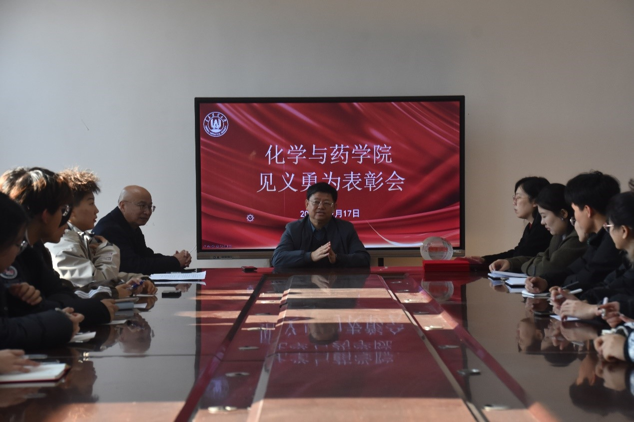 王进国为四名同学颁发了“见义勇为”证书和奖杯,对他们的见义勇为行为给予了高度肯定。他表示,这四名同学在人民群众生命面临危险的紧要关头,临危不惧、挺身而出,用行动展现出了优秀的品质人格以及作为化药学子、青农学子的担当精神。王进国呼吁广大师生应以王俊博、李自远、张俊哲、游越这四名同学为榜样,积极帮助他人、服务社会,弘扬见义勇为精神。同时,也希望全体同学能够内化于心、外化于行,在今后的学习生活中不断践行社会主义核心价值观,做真善美化药人。
