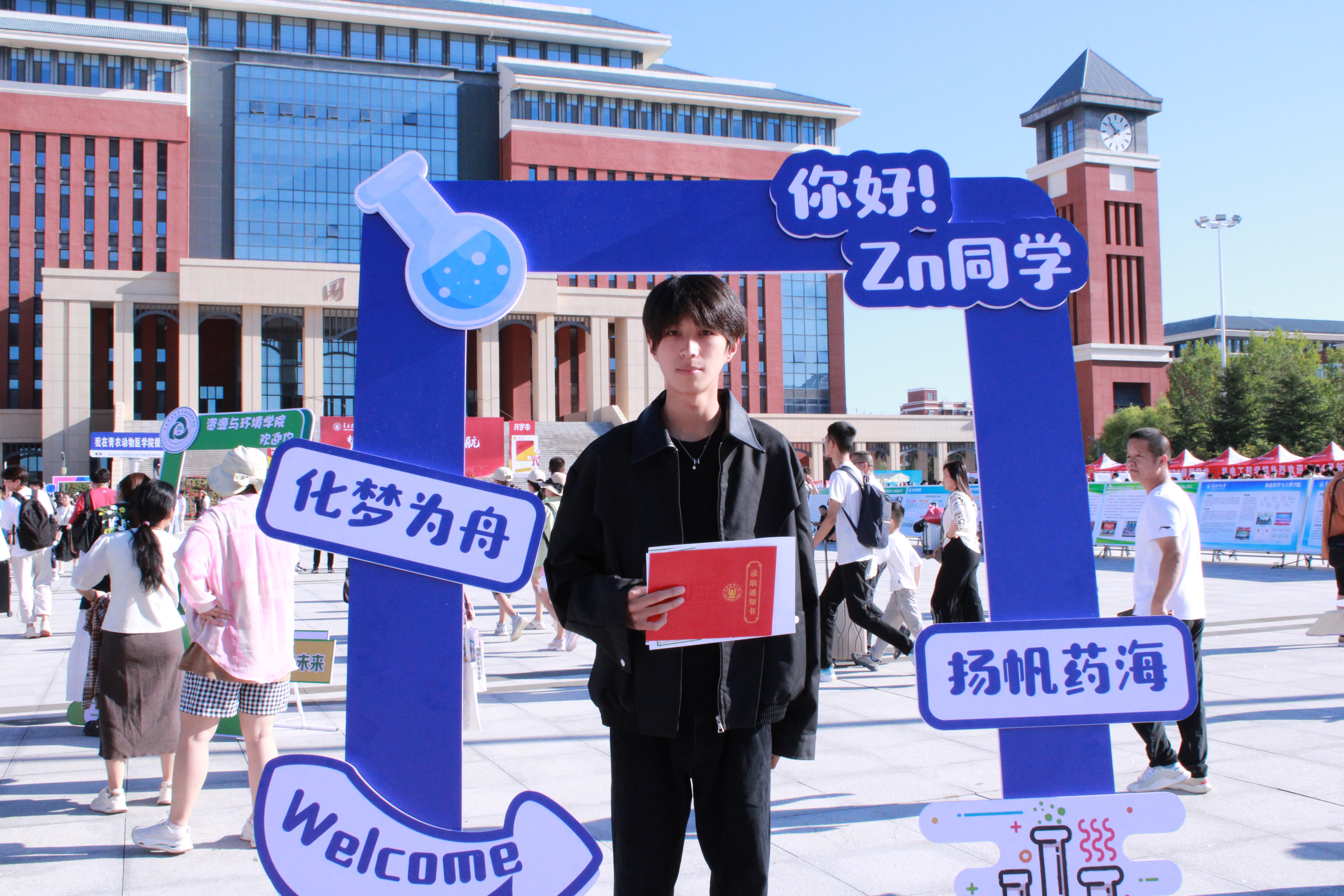 在迎新现场,学院创意设立化学趣味小实验互动项目,新生及家长们热情参与,亲自动手,进一步了解学院特色,感悟化学魅力。此外,学院提供合影展板及小型手持合影板,吸引了大量前来报道的新生合影留念。